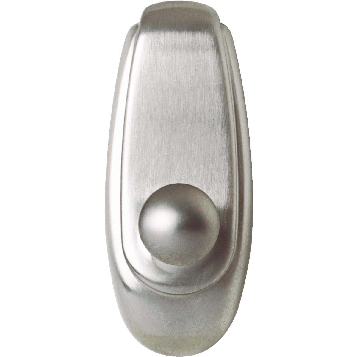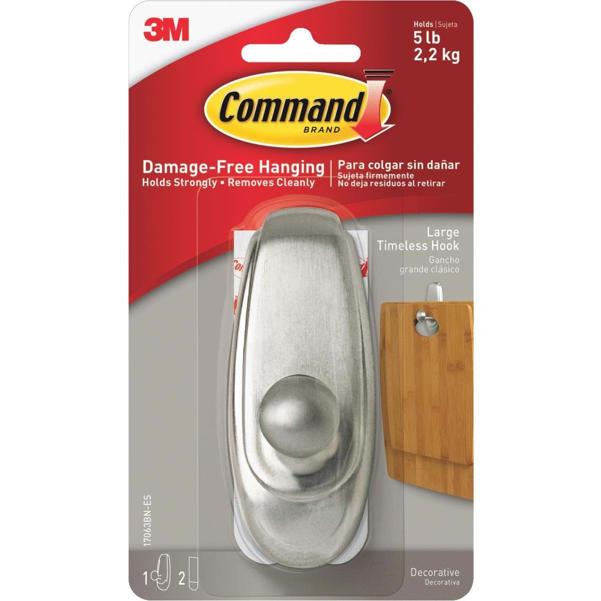 Reusable metallic finish plastic utility hook with Command adhesive. Holds firmly until you want to take it down. Easy-to-apply. Easy-to-remove. Adhesive releases cleanly, without damaging walls, or leaving behind any sticky residue. To reuse, just use the extra adhesive strip and repeat application. Timeless brushed nickel finish.