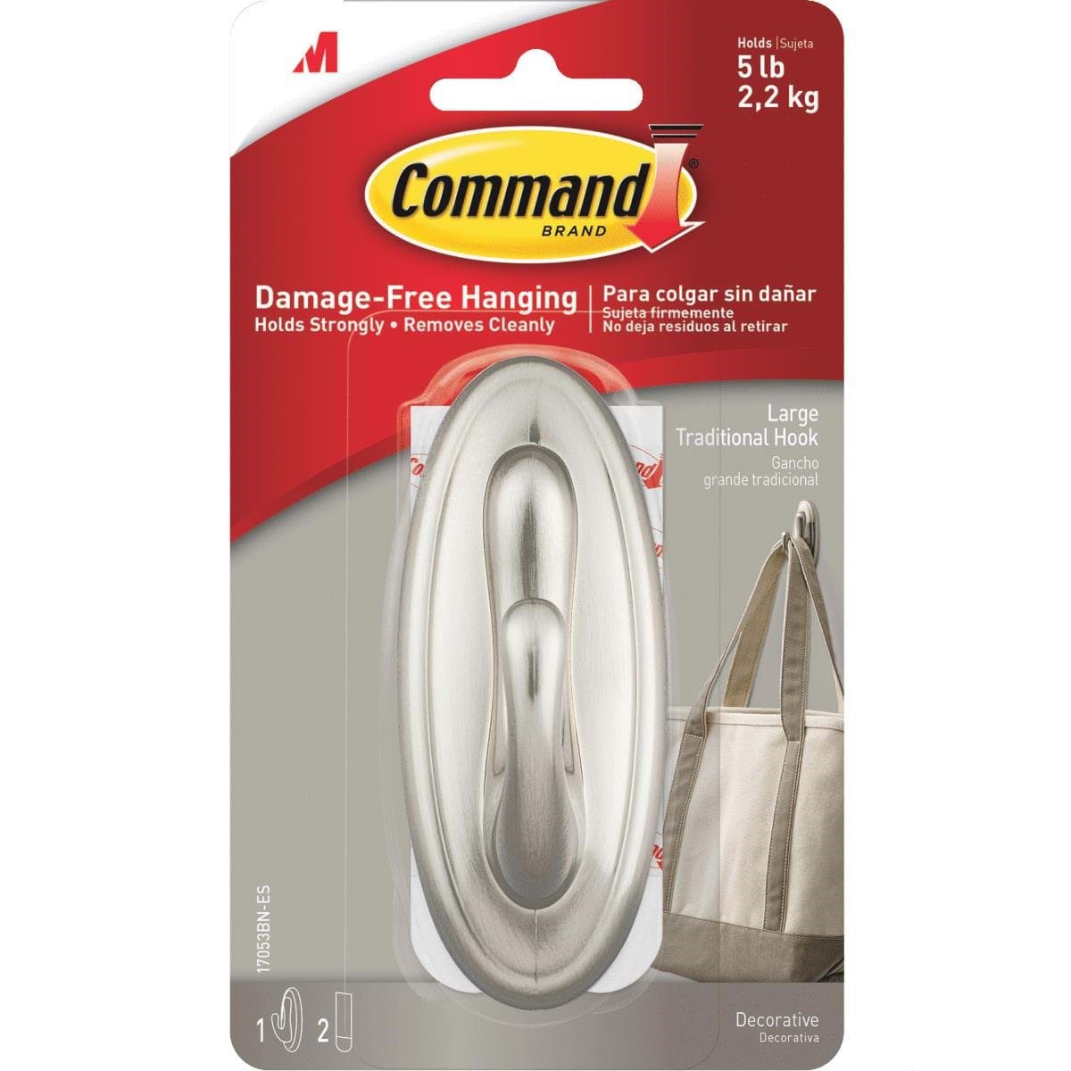 Reusable metallic finish plastic utility hook with Command adhesive. Holds firmly until you want to take it down. Easy-to-apply. Easy-to-remove. Adhesive releases cleanly, without damaging walls, or leaving behind any sticky residue. To reuse, just use the extra adhesive strip and repeat application. Traditional brushed nickel finish.