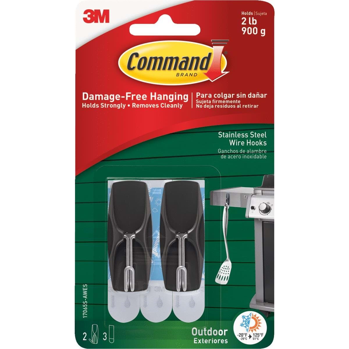 Command outdoor stainless steel wire hooks give you the freedom to decorate the outside of your home for every season, holiday or event. They are perfect for hanging grilling utensils, wreaths, signs, thermometers, artwork, or other decorations on a variety of smooth outdoor surfaces, such as doors, siding, or trim. Using the new formulation of the revolutionary Command Adhesive, these outdoor hooks are specially designed to hold strongly outdoors - they are water resistant, UV resistant, and can handle temperature extremes from -20 F to 125 F (Degree Fahrenheit). And like all Command products, they remove cleanly - with no holes or sticky residue - so you can use them over and over again. Contains 2 medium hooks and 3 outdoor strips. Holds up to 2 Lb.
