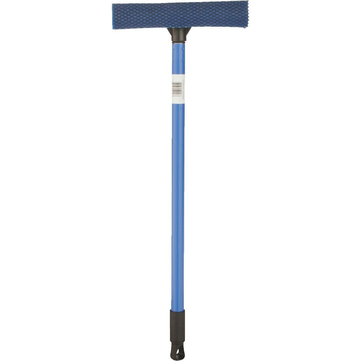 Lightweight plastic 8" head that will not rust. Durable rubber blade. Tough nylon netting for easy bug removal. Absorbent sponge wrapped in honeycomb scrubbing nylon holds washing liquid and loosen dirt. Blue 16" metal handle. Scrub, flip, and squeegee.