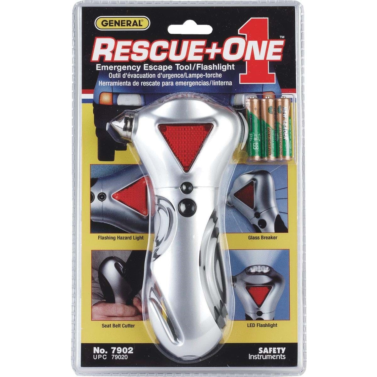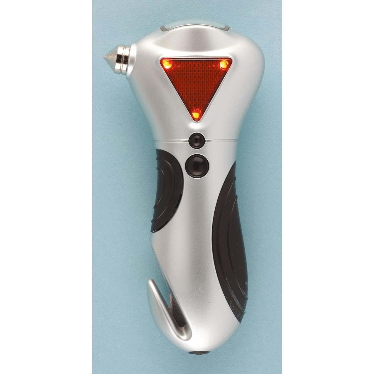 Emergency escape tool, designed for escape from an automobile. Tool is a flashlight, it has a flashing hazard light, glass break punch to break side auto windows, and houses a seat belt cutter. Includes 3 "AAA" batteries.