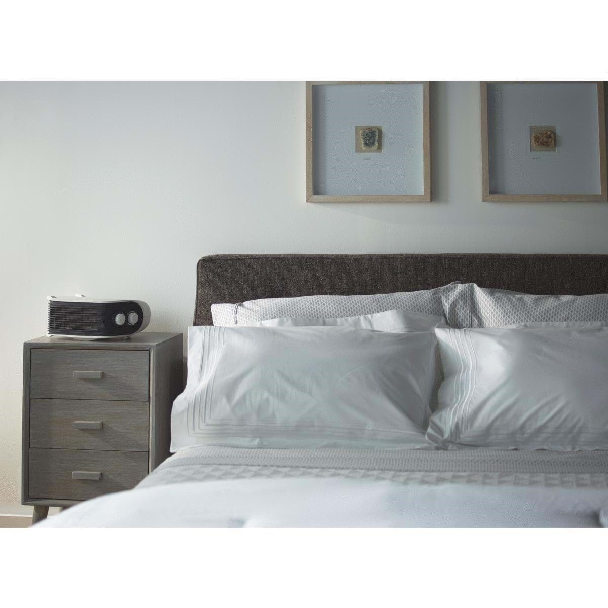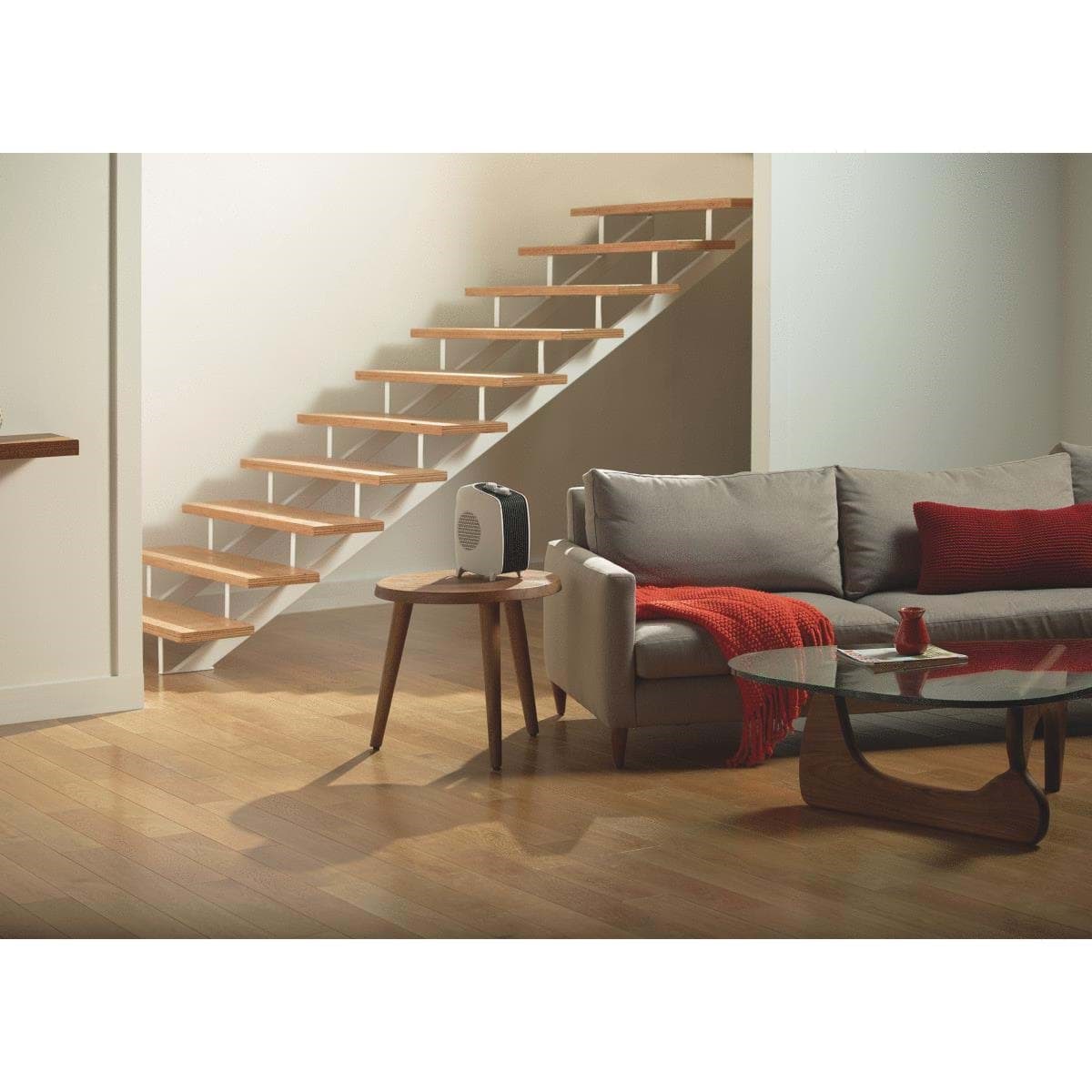 Dual position fan-forced heater provides comfortable, even heating and personal warmth. Ideal for use in offices, on tabletops and other personal/small spaces. Easy to use top mounted adjustable thermostat dial controls with 2 heat settings and fan only setting. Dual position operation allows for standing upright or on it's side. Safety features include cool touch housing and handle, overheat protection. Exceeds industry safety standards.