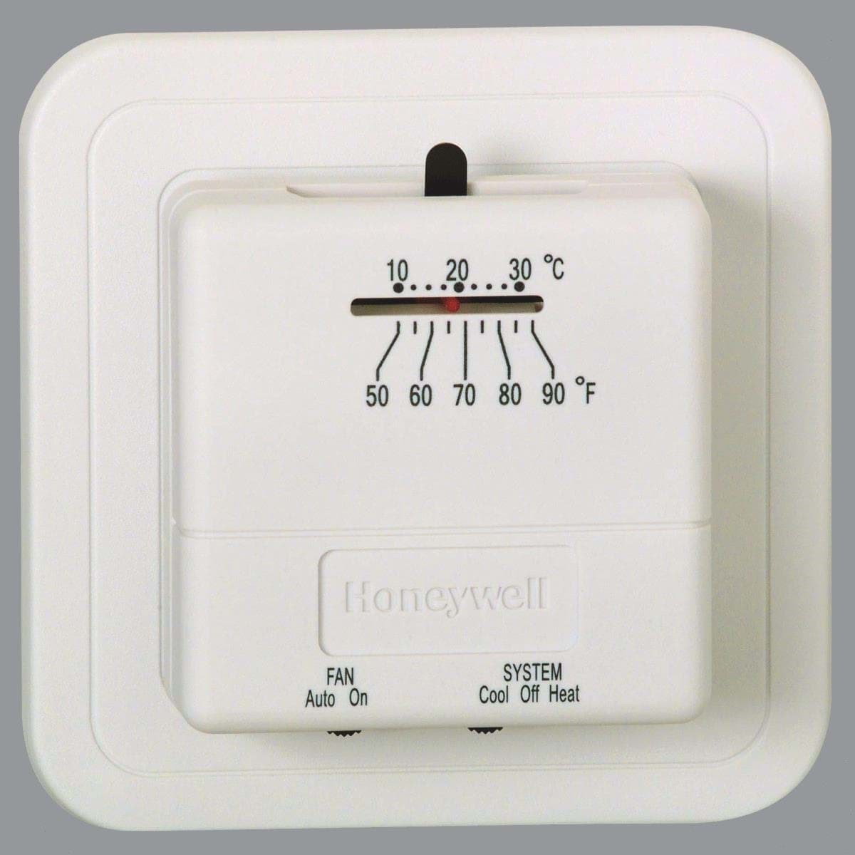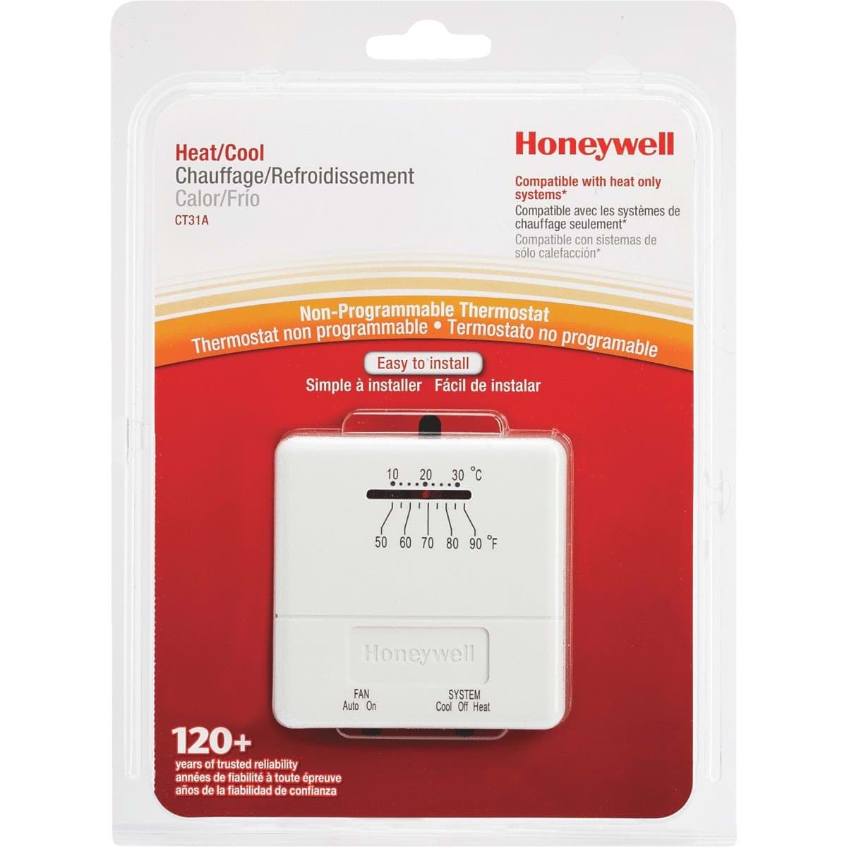 Low voltage control of gas or oil heating and cooling equipment. Bimetal temperature sensor. Snap acting switch (magnetic switch) does not require leveling and is mercury-free. Simple, worry-free operation. Dual temperature scale F deg./C deg.. Decorative backplate included.