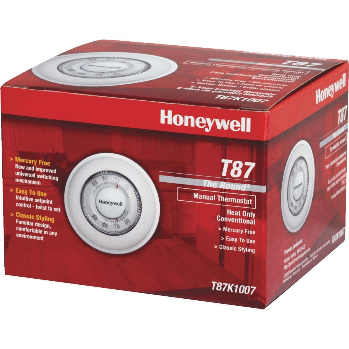 Mercury free builders pack. The Round thermostat is one of the most recognizable and popular temperature control units. It's reliable performance, classic styling, and convenience have made it an industry standard. Adjustable heat range from 40 deg. F. to 90 deg. F. Use with most residential gas, oil, steam, and gravity systems. Comfort control adjustable heat anticipator provides even control. Easy-to-use familiar design and twist-to-set interaction. Off white.