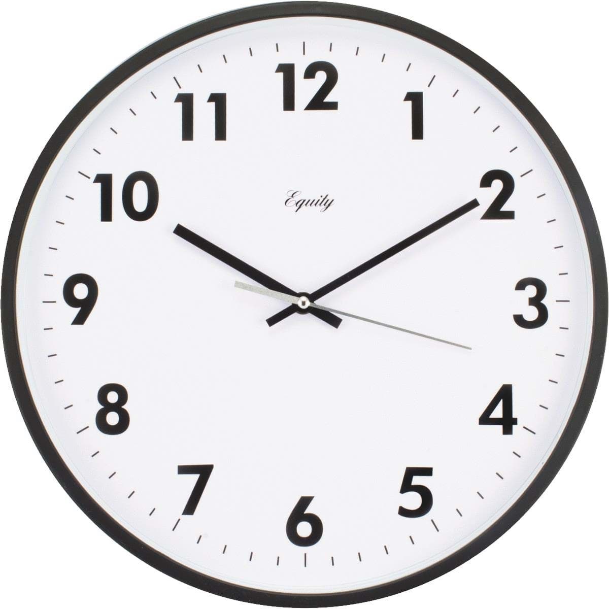Analog quartz movement. Black plastic case with glass lens and metal hands. Requires 1 AA battery (not included). 14" diameter x 2" D.