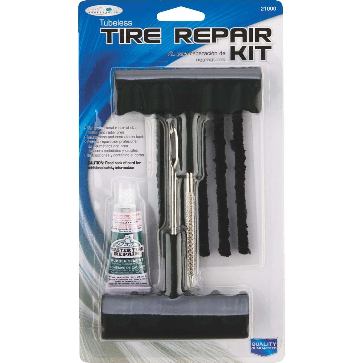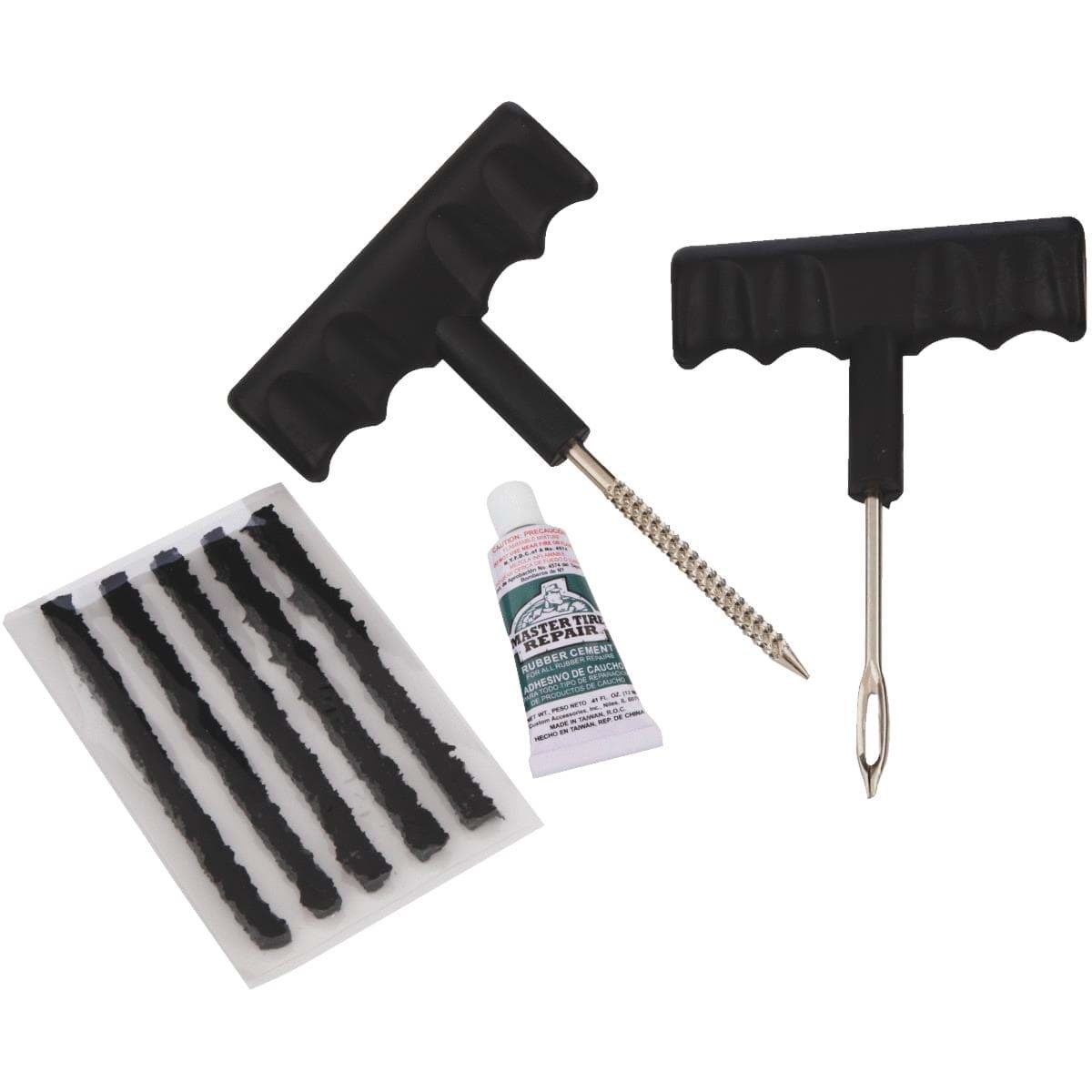 For professional repair of steel belted and radial tires. 1 rasp tool, 1 inserting tool, 5 repair strings and 1 tube rubber cement. Instructions: Do not repair tires with punctures greater than 1/4 in. Don not repair a sidewall puncture and contact a professional before use.