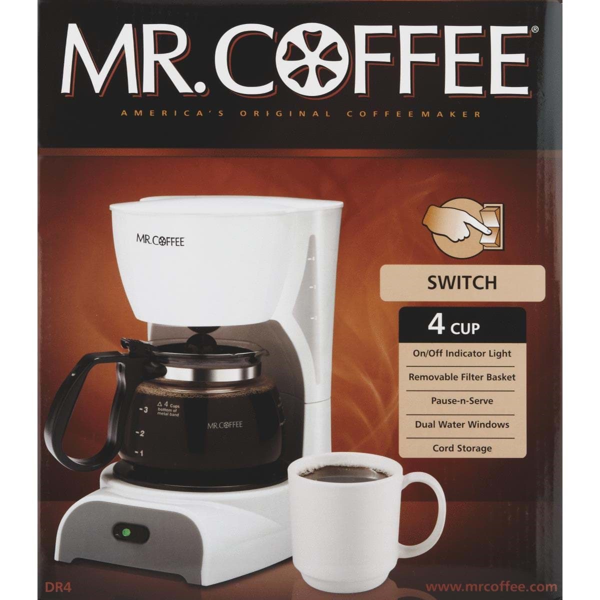 Brewing Pause 'n Serve lets you pour a cup of coffee while the coffee maker is still brewing. Removable filter basket lifts out of brew basket for fast and easy filling and cleaning. Dual water windows shows the amount of water in the reservoir for accurate filling. Stain-resistant warming plate is easy-to-clean and prevents stains. Cord storage safely stores excess cord to keep your countertop neat. Lighted On/Off switch lets you know when your coffeemaker is On or Off. Dimensions: 8.85 In. W. x 10.71 In. H. x 6.77 In. D. White.