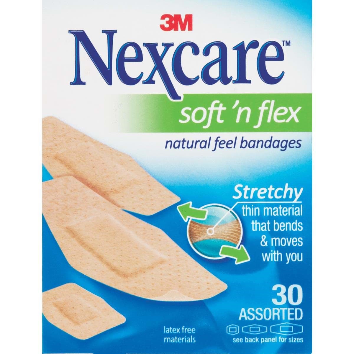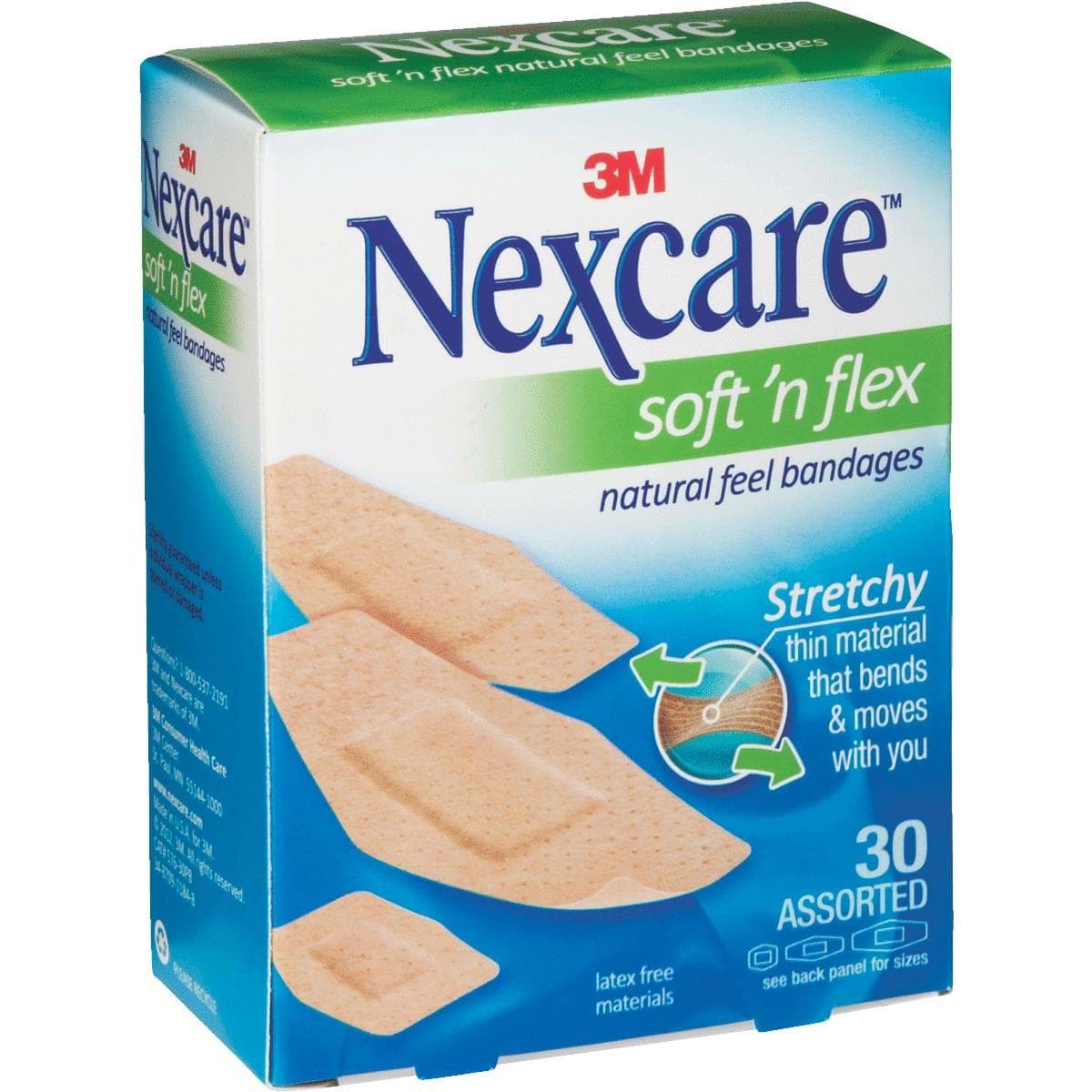 Stretchy, thin Nexcare bandages bend and move. Soft, breathable material allows sweat and moisture to evaporate. Unique shape designed for better seal around pad. Assorted sizes include: (8) 15/16" x 1-1/8", (8) 1-1/8" x 3", and (14) 7/8" x 2-1/4". Latex-free.