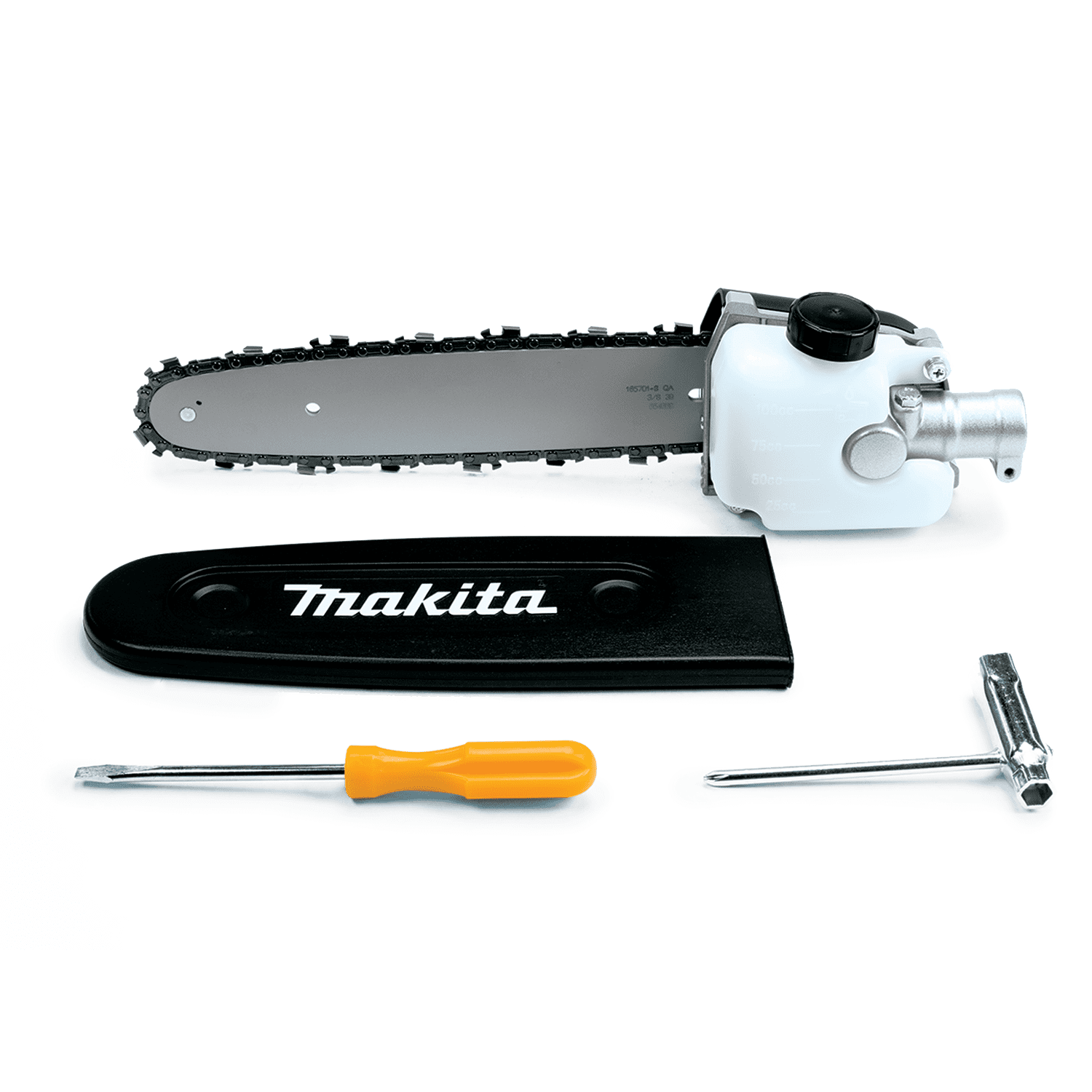 Makita Pole Pruner Attament can be quickly installed to convert a Makita MM4 Grass Trimmer to a Pole Pruner. This attament is designed with a translucent bar oil tank and adjustable oiler for efficient operation. The 10" reversible sprocket nose bar is ideal for pruning branches. 10” reversible sprocket nose bar for efficient pruning of branches. Translucent bar oil tank with adjustable chain lubrication for efficient operation. Quick and easy to install. Converts Makita MM4 Grass Trimmer to Pole Pruner.