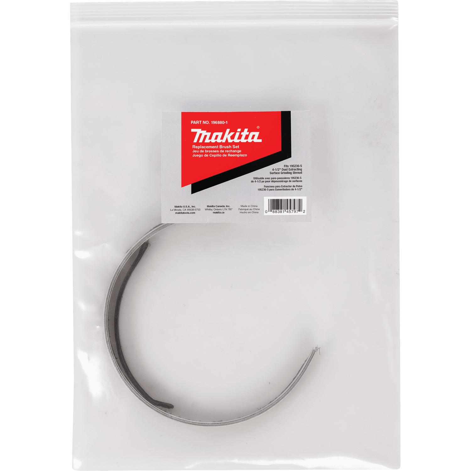 Makita grinder dust shrouds feature a spring-loaded suspension system that keeps the shroud flush to the surface during movement and compensates for blade wear, with soft brushes that help contain the dust and allow for smooth movement over the work surface. After extended use the soft brushes may require replacement, and the Makita Replacement Brush Set installs quickly and easily to help your grinder dust shroud maintain efficient extraction when used with a Makita 4-1/2" grinder and vacuum (grinder dust shroud, grinder and vacuum sold separately). Replacement Brush Set model 196880-1 is for use with the Makita 4-1/2” Dust Extracting Surface Grinding Shroud (195236-5). Soft brushes help prevent dust from escaping and help move the tool over the surface. Installs quickly and easily. Durable metal spine holds brushes in place. For use with 4-1/2" Dust Extracting Surface Grinding Shroud (195236-5).
