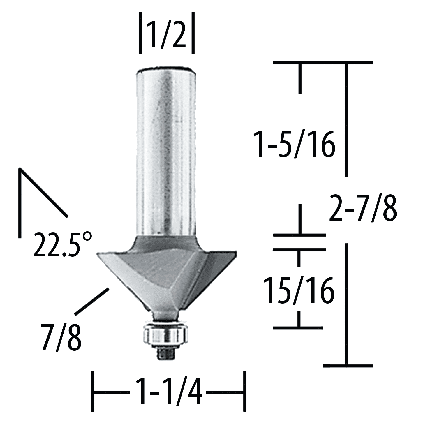 - INCLUDES - Router Bit 22.5 Degree Chamfer 7/8" Length, 2 Flute, 1/2" SH, C.T.