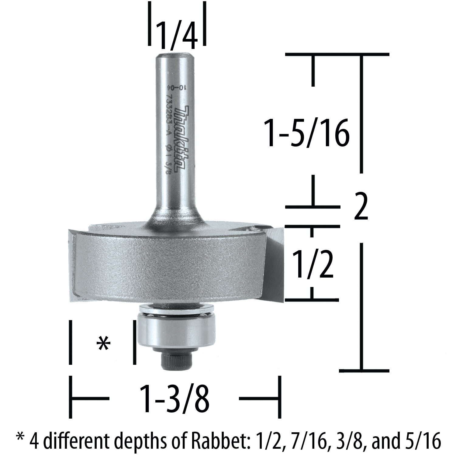 Makita Router Bits are designed to work with routers in a variety of routing applications. The bits feature high quality carbide for more efficient material removal. Each bit is manufactured from high quality steel for added durability and long life. Carbide tipped for improved speed and long life. Ideal for rabbeting or step cutting edges without the use of router edge guides. Ball bearing pilot for improved accuracy and efficiency. For use with routers that accept 1/4" shank bits.