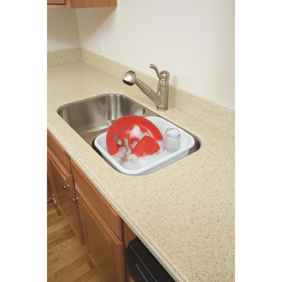 Dishpan fits standard twin or single sinks. Molded-in grip areas provide portability. Dishpan is great for washing dishes, soaking laundry, and other tasks. 5.67" x 12.55" x 14.45".