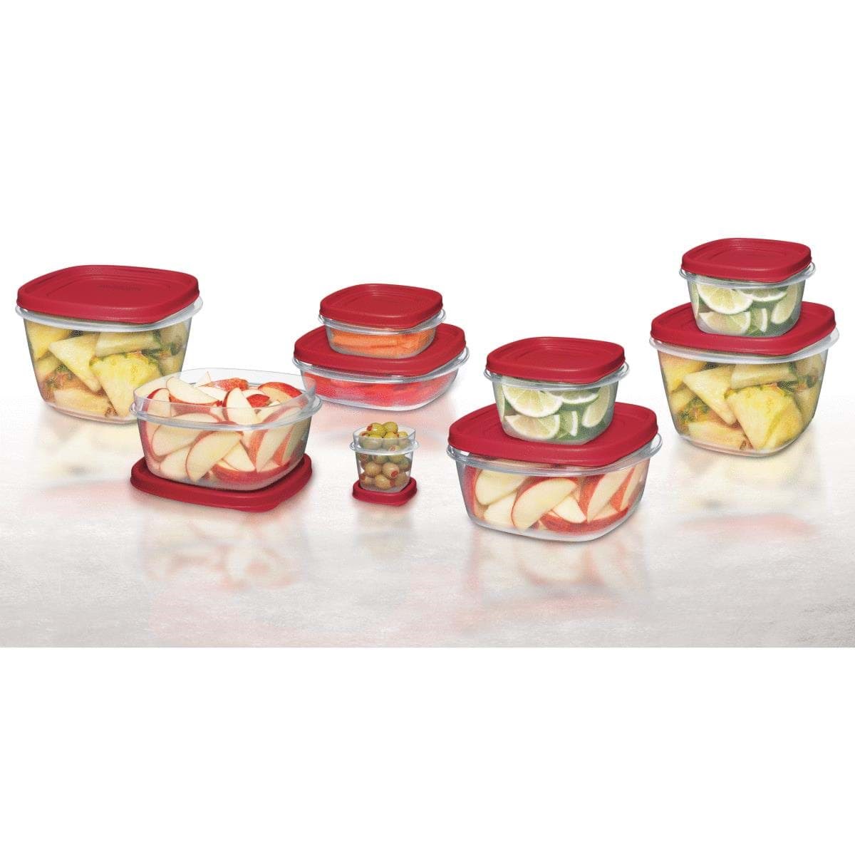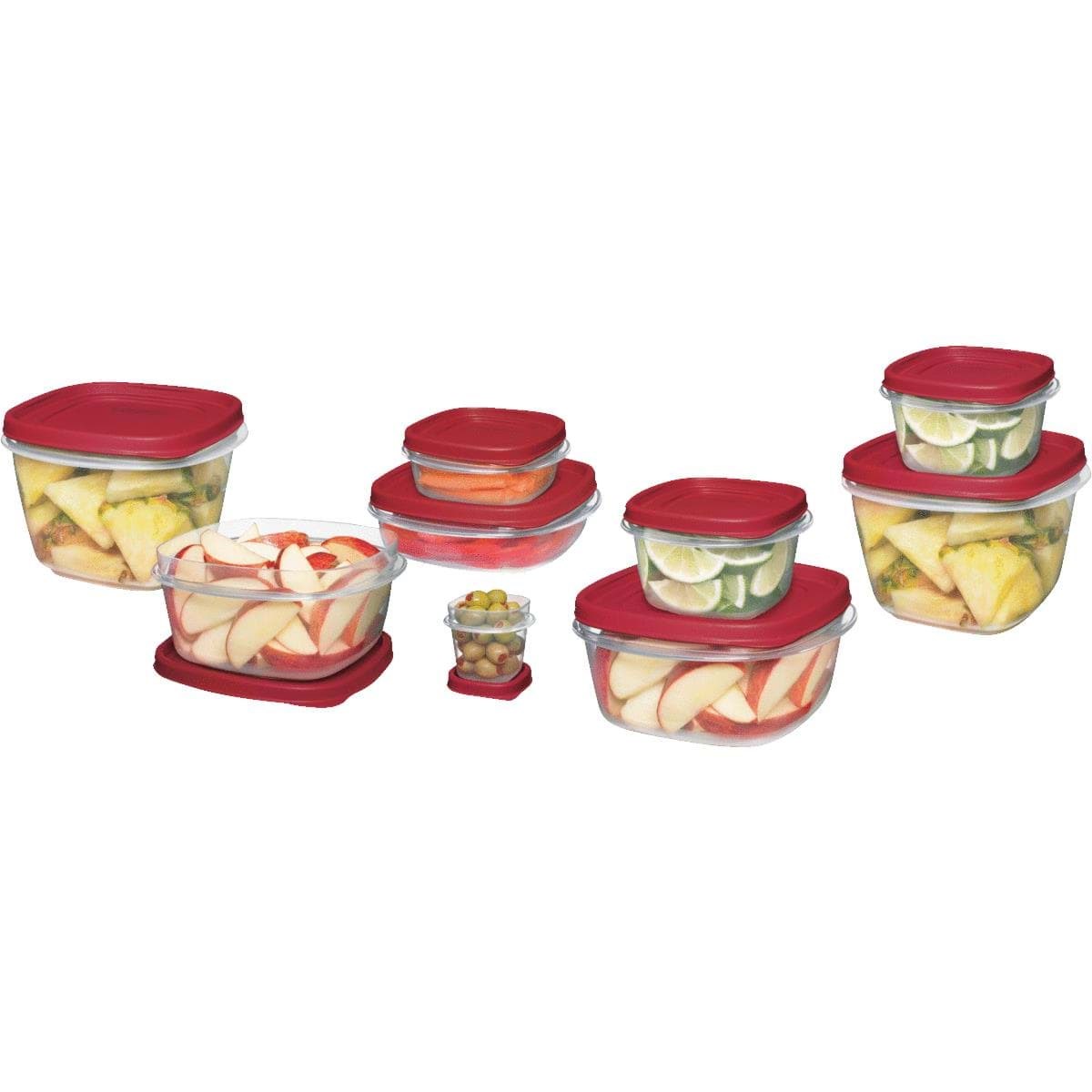 The right lid is always at hand. Lids snap to base and to other lids. 1 lid fits multiple bases. Bases and lids nest inside each other for easy storage and space saving. Super-clarified base to see contents. Square and rectangular shapes preferred for organization. Safe for use in freezer, microwave, and dishwasher. Set includes: (2) 5 cup containers with lids, (2) 1.25 cup containers with lids, (2) 2 cup containers with lids, (2) 3 cup containers with lids, (2) 5 cup containers with lids, and (2) 7 cup containers with lids. Racer red lids.