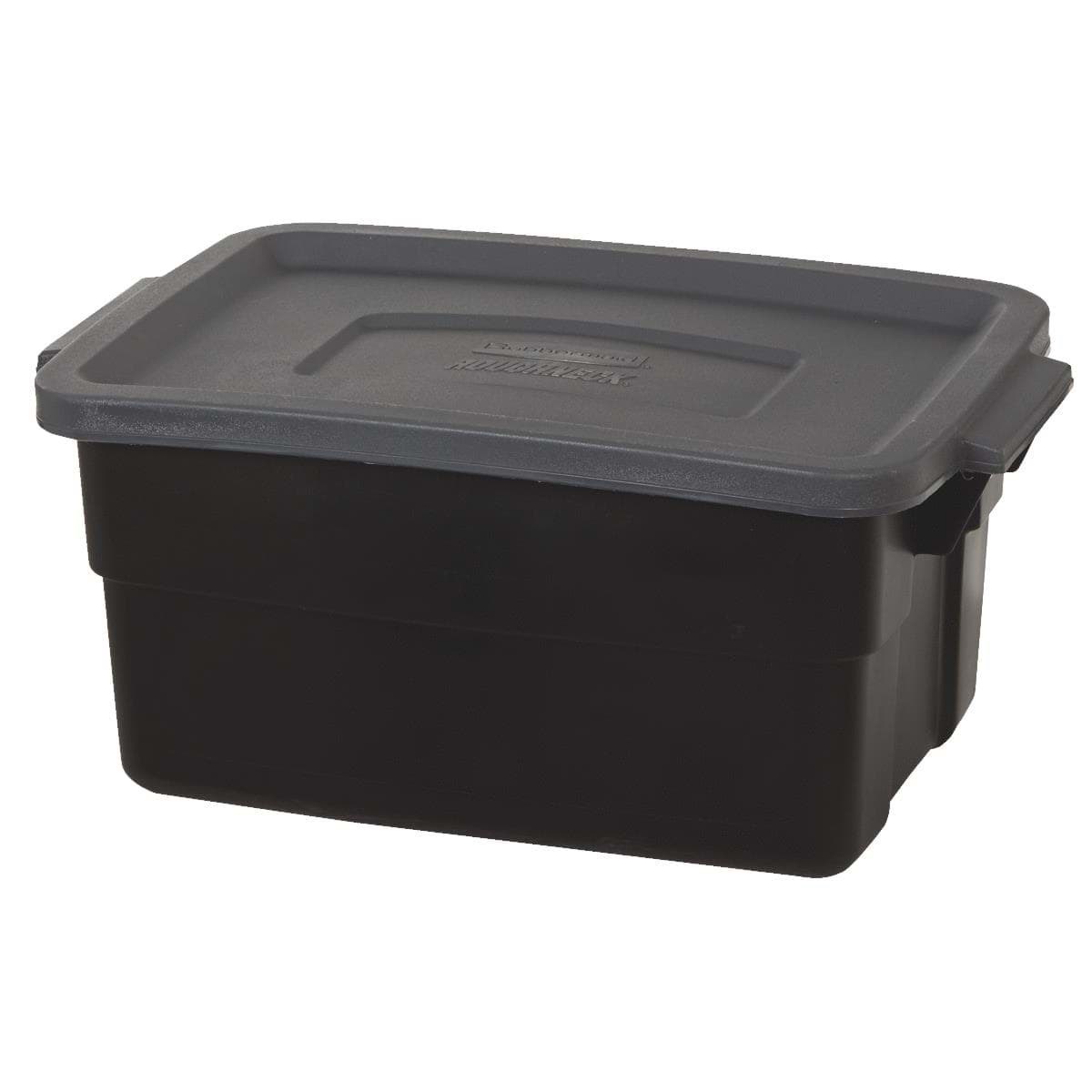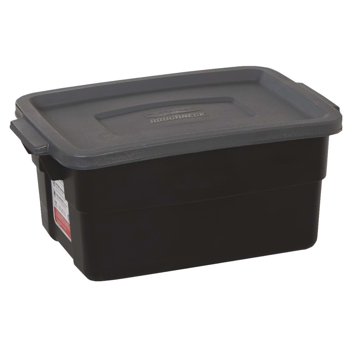 Durable polyethylene, rugged storage boxes can withstand harsh temperatures from hot to cold. Sturdy, built-in handles allow for easy carrying. Snap-on, stay-tight lids help keep contents dry and dust-free. All units are stackable for saving valuable storage space. Black with gray lid.