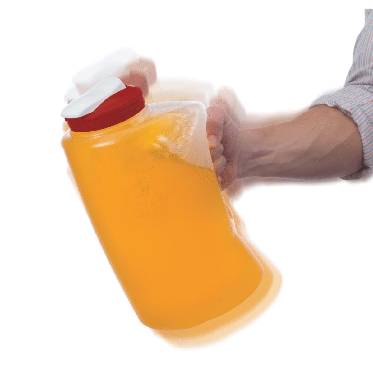 Beverage storage container. New stylish design. Features ergonomic comfort handle. Graduated base for measuring or mixing. Dishwasher safe. Push and pour spout. Clear white pitcher with racer red colored lid.