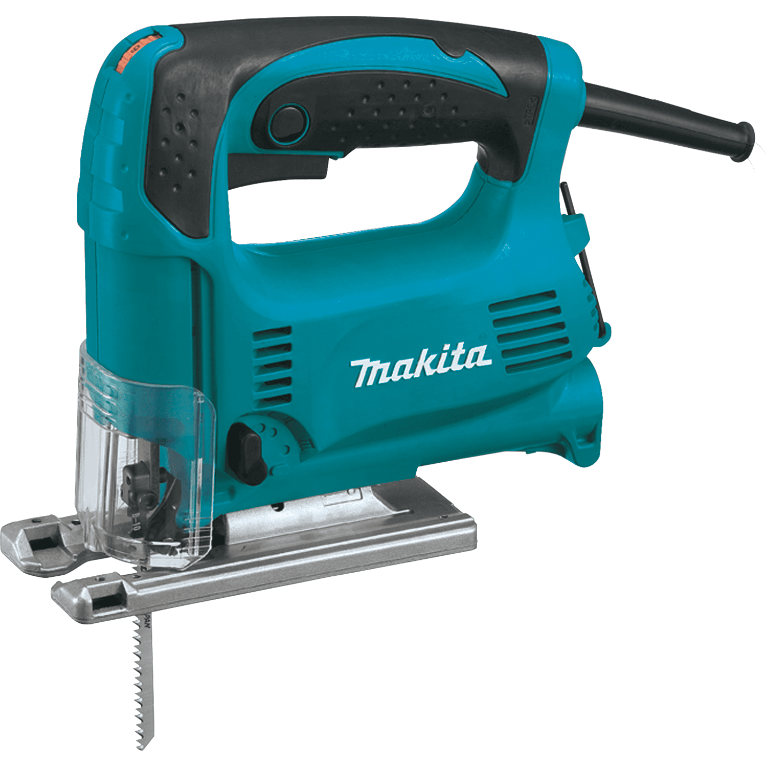 The Makita Top Handle Jig Saw (model 4329K) combines power with a compact design and ease-of-use features for a range of cutting applications. The 4329K has three orbital settings plus straight cutting, and features an ergonomically designed rubberized grip to provide more comfort and control. A through-the-body dust port provides optimal dust management with use of clear dust cover and vacuum. The counterweight balancing system is engineered for reduced vibration and improved comfort. The saw also features a large trigger switch for easy operation and lock-on button for extended use. Variable speed control dial (500-3,100 SPM) enables user to match the speed to the application for optimal cutting performance in a variety of materials. Ergonomically designed rubberized grip for increased comfort and control. Counterweight balancing system for reduced vibration. Die-cast aluminum base adjusts up to 45° right or left and positive stop at 90° for solid cutting performance. Through-the-body dust port provides optimal dust management with use of clear dust cover and vacuum. 3 orbital settings plus straight cutting with a powerful 3.9 AMP motor for use in a variety of materials. Large trigger switch for easy operation. Lock-on button for extended operation. Onboard hex wrench for fast and easy blade changes and bevel adjustments. Uses Tang shank blades.