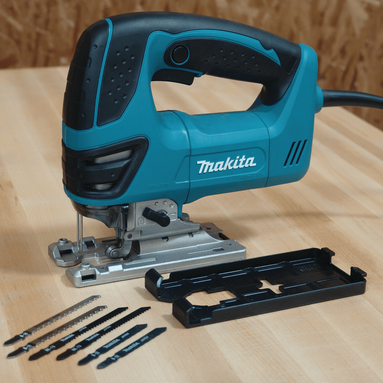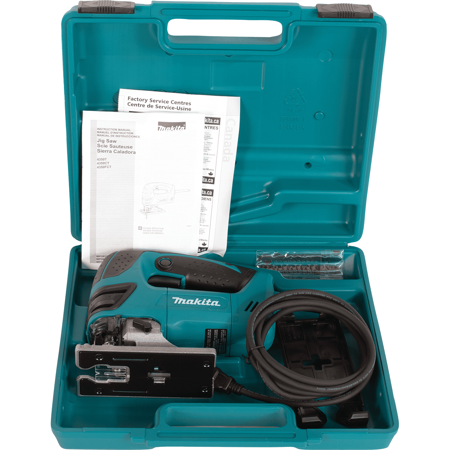 Makita’s Top Handle Jig Saw, Model 4350FCT, combines power and superior feel with substantially less vibration and noise for improved cutting performance. It is ideal for woodworkers, cabinet makers, remodelers, and general contractors seeking a best-in-class top handle jig saw. The 4350FCT has three orbital settings plus straight cutting, powered by a Makita-built 6.3 AMP motor. The electronic variable speed control (800 – 2,800 SPM) is engineered to maintain consistent speed throughout the cut for superior results. The motor is dynamically balanced for 40% less tool vibration and lower noise than competitive models. The 4350FCT has a 1-inch length of stroke, with a wood cutting capacity of 5-5/16 inches at 90° and a steel cutting capacity of 3/8 inches at 90°. 3 orbital settings plus straight cutting with powerful 6.3 AMP motor for cutting in all varieties of materials. Variable speed control dial (800-2,800 SPM) enables user to match the speed to the application for superior results. "Tool-less" blade change system for fast and easy blade installation and removal. Uses Tang shank blades. 40% less tool vibration with the lowest noise level in its class. Built-in LED light illuminates the line of cut for increased accuracy. Electronic speed control maintains constant speed under load. Soft start feature for smooth start-ups. Die-cast aluminum base adjusts up to 45° right or left and positive stop at 90° for solid cutting performance. Ergonomically designed rubberized top handle grip for added comfort. Onboard hex wrench for fast, accurate bevel adjustments. Built-in dust blower clears the line of cut for increased accuracy. Through-the-body dust port for use with a dust nozzle (optional accessory) and vacuum (optional accessory) provides efficient dust management.