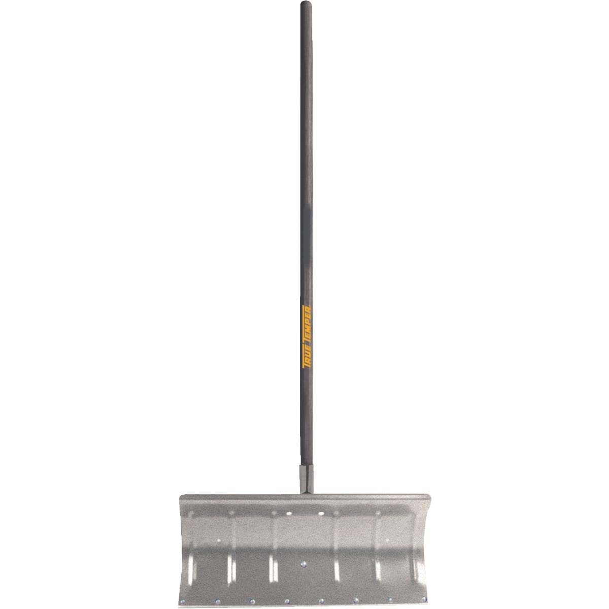 Aluminum blade snow pusher with steel wear strip to extend blade life. Stained ash handle.