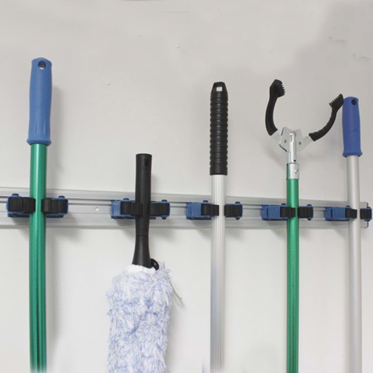 Connect & Clean System. Flexible rubber grips firmly hold telescopic poles, handles, cleaning attachments, mops, and brooms. Sliding adjustable brackets accommodate a variety of product widths. Heavy-duty extruded aluminum channel with mounting hardware included. 5 brackets.