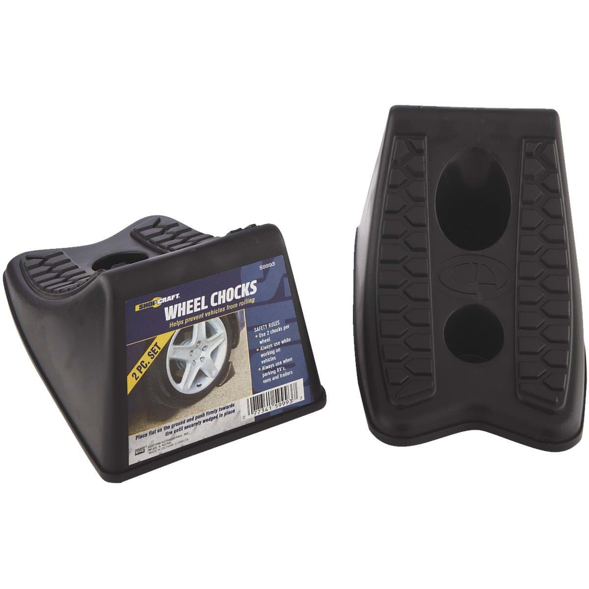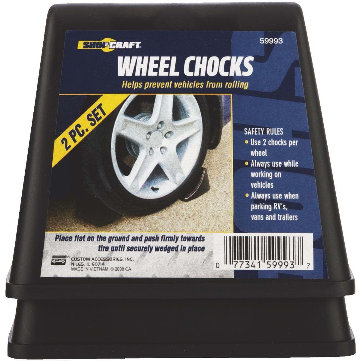 ABS plastic heavy-duty wheel chocks. Resists slipping and safely prevent vehicle movement during repairs. Approximate size: 8.25" L. x 5.75" W. x 4.75" H. Black. 1 pair.