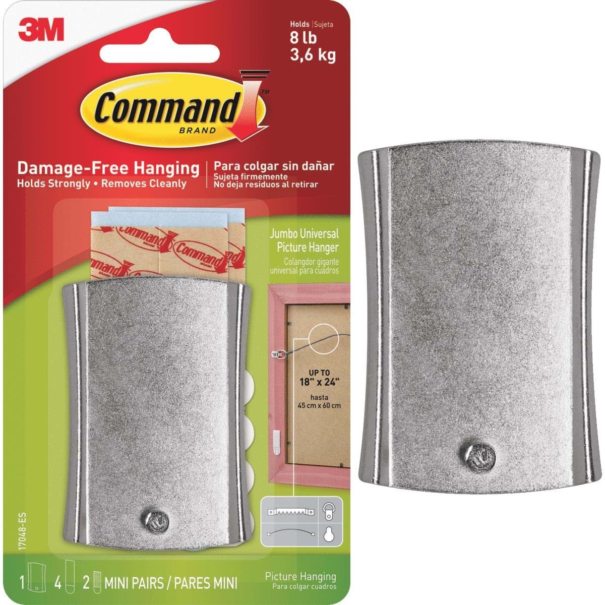 Command wire-back hanger kit can be used to hang pictures without damaging walls or creating nail holes. Works on a variety of surfaces and is made from metal. For use with frames up to 18" x 24". Includes 1 hanger, 4 large strips and 4 mini strips.